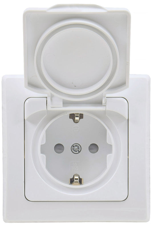 Trano Schutzkontakt-Steckdose IP44 250V~/16A inkl. Rahmen UP weiß & silber | Spritzwassergeschützt, Klapp-Deckel, 80x80mm