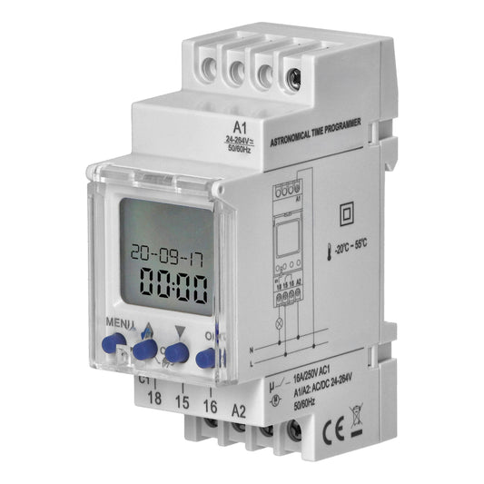 Trano DIN-Schienen-Zeitschaltuhr digital, 100 Programme, 16A/230V, 24–264V AC/DC, astronomisch, 3 Sprachen, 2 Module, IP20