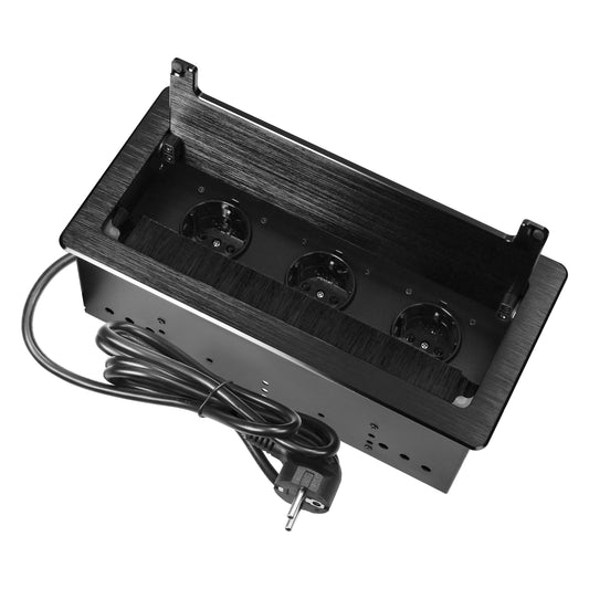 Trano Einbausteckdose 3x Schuko Typ F, flacher Rand 2mm, Anti-Staub-Bürste, 1,5m Kabel, 3680W, IP20, schwarz 265x130mm