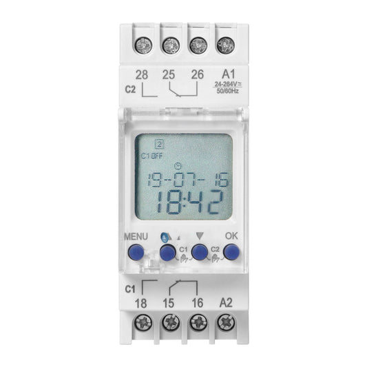 Trano DIN-Schienen-Zeitschaltuhr digital, 100 Programme, 16A/230V, 24–264V AC/DC, astronomisch, 3 Sprachen, 2 Module, IP20