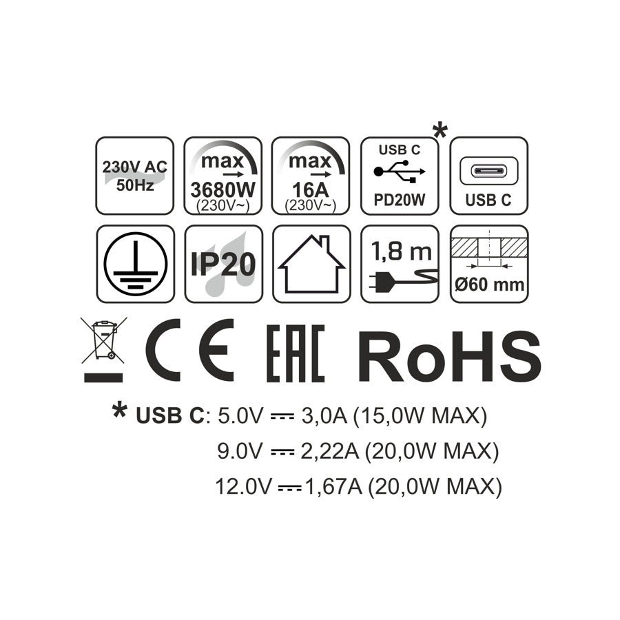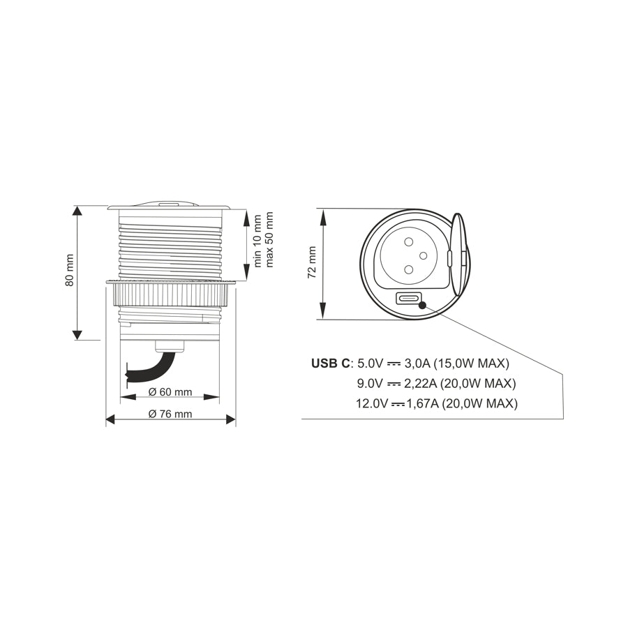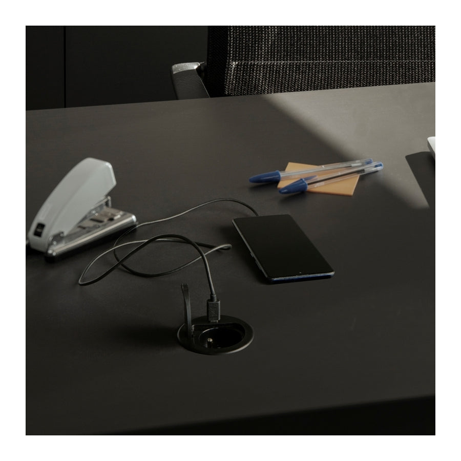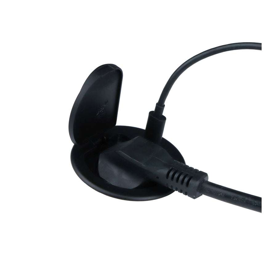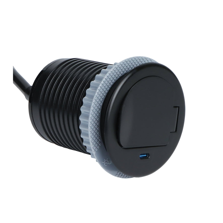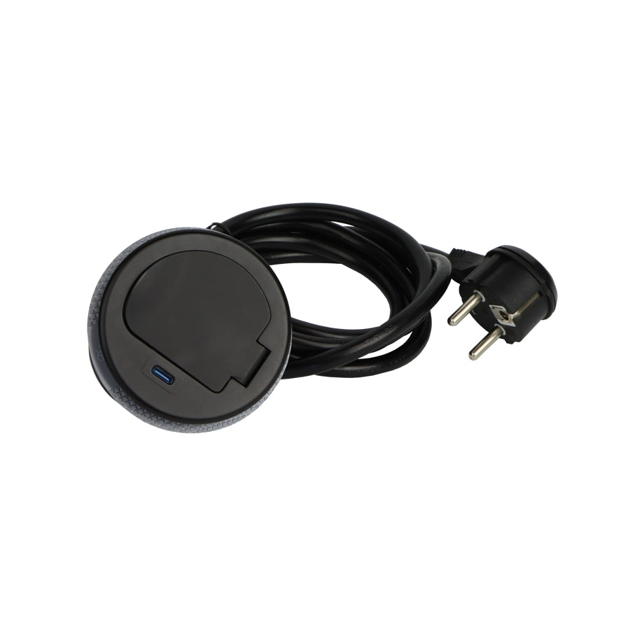 Einbausteckdose mit USB-C, schwarz, 230V AC, 3600W, IP20, Ø72mm, 1,8m Kabel