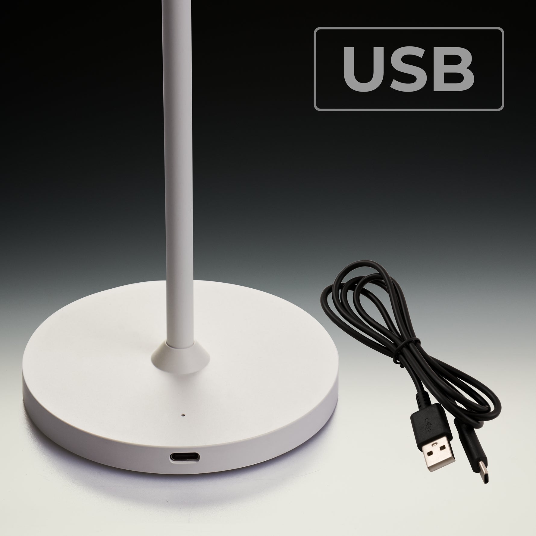 Entdecken Sie unsere dimmbare LED-Tischleuchte in elegantem Weiß, die Design und Funktionalität perfekt vereint. Mit ihrer kabellosen Akku-Funktion und kompakten Größe von 25cm ist sie die ideale Beleuchtungslösung für jede Situation – ob drinnen oder draußen.