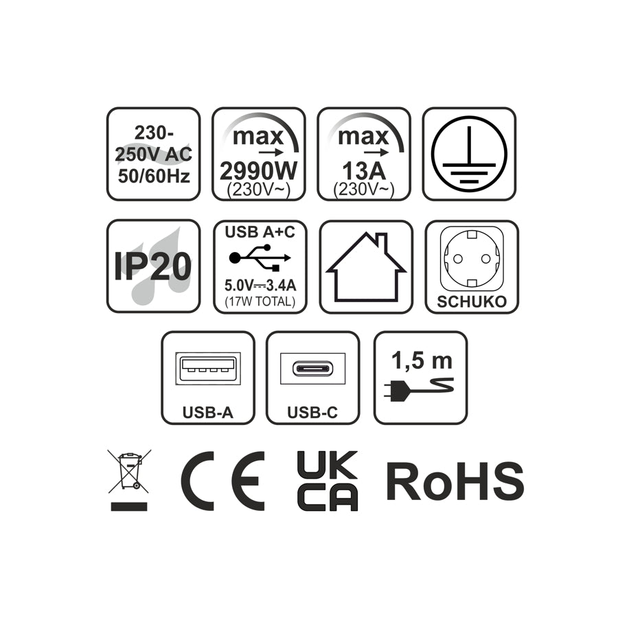 - USB-Anschlüsse: Laden Sie Ihre Geräte bequem über die integrierten USB-Anschlüsse (Typ A und Typ C).