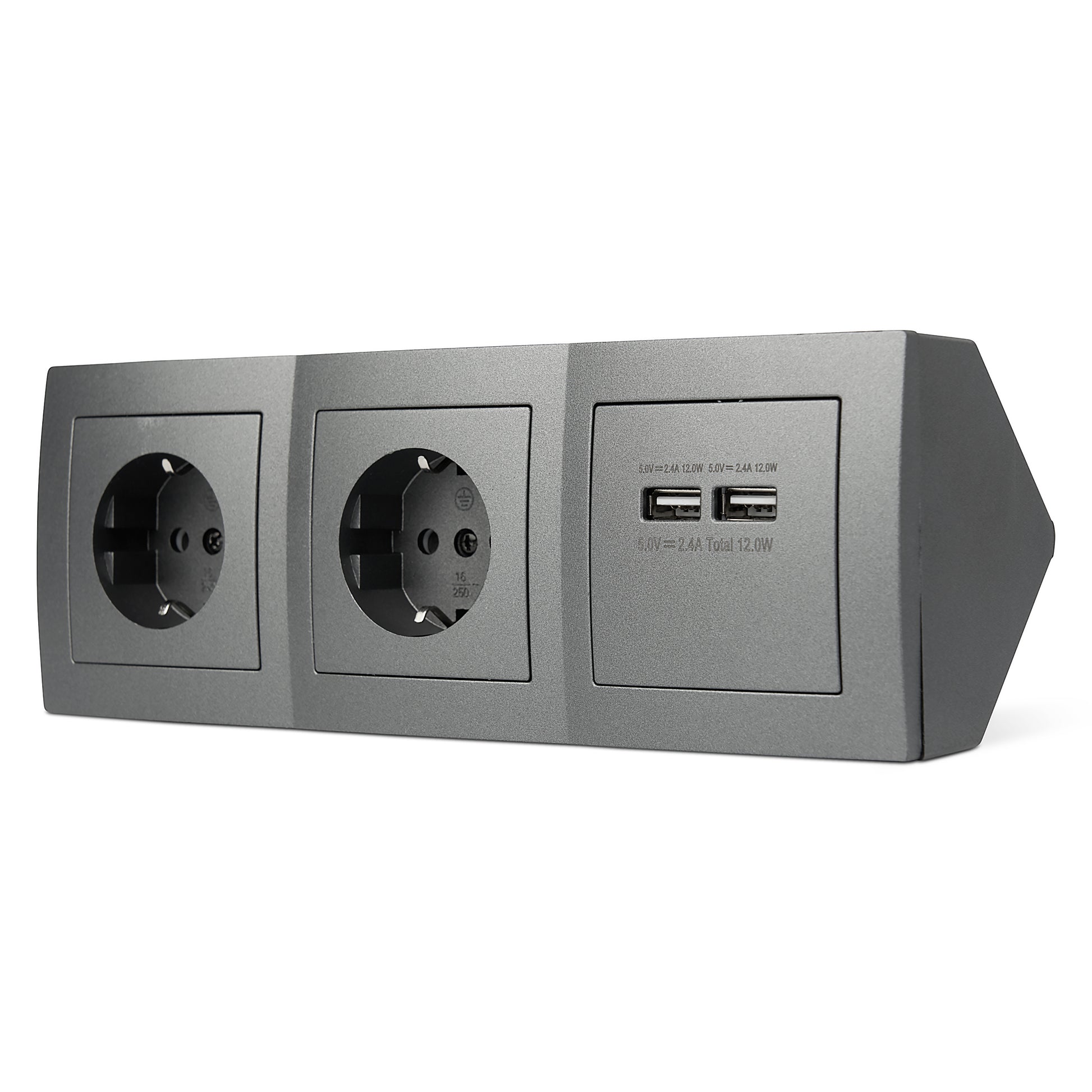 Neben den beiden Steckplätzen (maximale Last 3600 Watt/ 16 Ampere) mit Schutzkontakten, beherbergt diese edle Möbelsteckdose ebenfalls 2 USB Anschlüsse (maximal 2,4 Ampere).