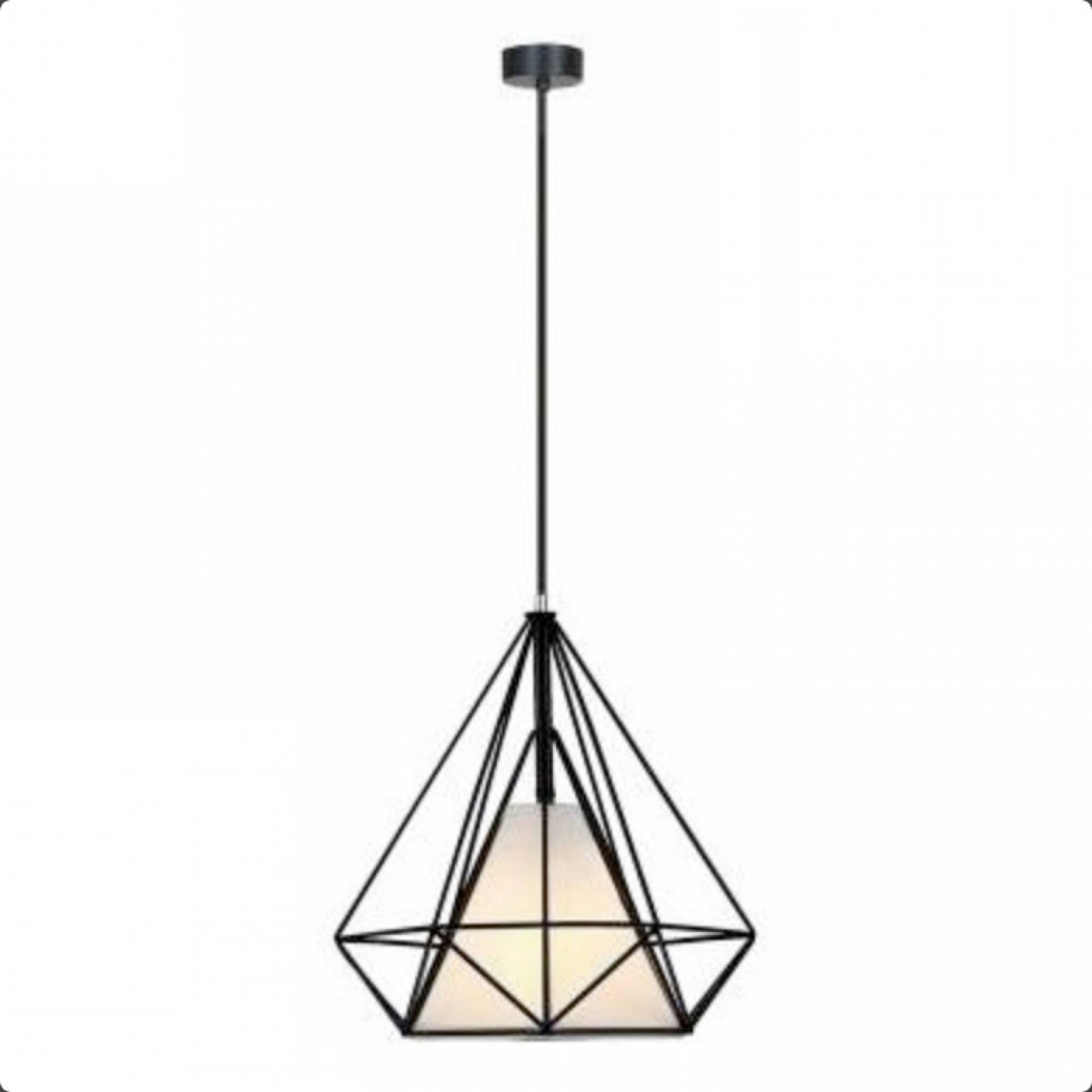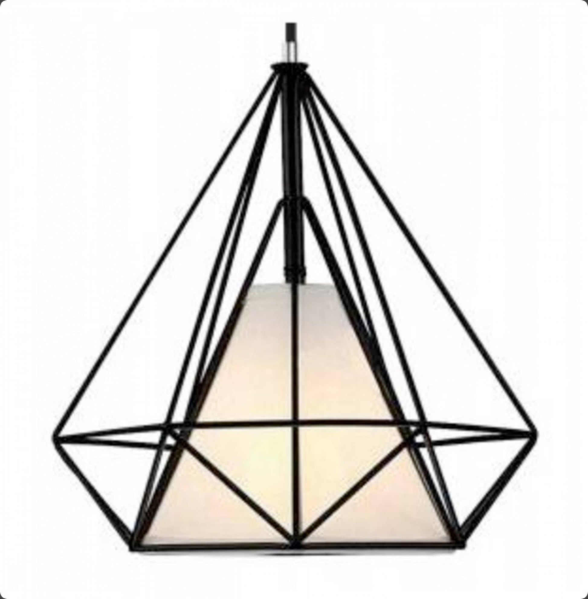 Einzelne Metallstränge bilden zusammen mehrere Dreiecke und lassen daraus eine besondere Form / Diamantenform entstehen. In der Mitte der Pendellampe, zwischen den inneren Dreiecken befindet sich ein Element aus Stoff. Unter diesem Stoffelement befindet sich die E27 Fassung, wo später eine E27 LED Leuchtquelle eingesetzt wird. (Leuchtmittel nicht enthalten)