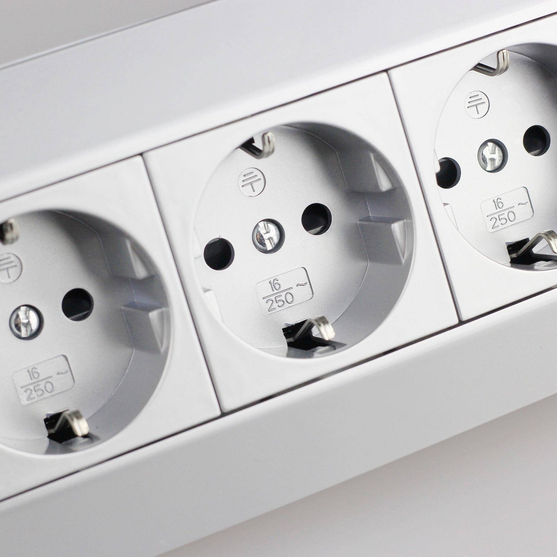 Die praktische Einbausteckdose schafft Ordnung und beinhaltet 3 Steckdosenelemente mit Schutzkontakt. Es können also bis zu drei Endgeräte gleichzeitig mit Strom versorgt werden, die maximale last von 3600 Watt darf dabei nicht überschritten werden.