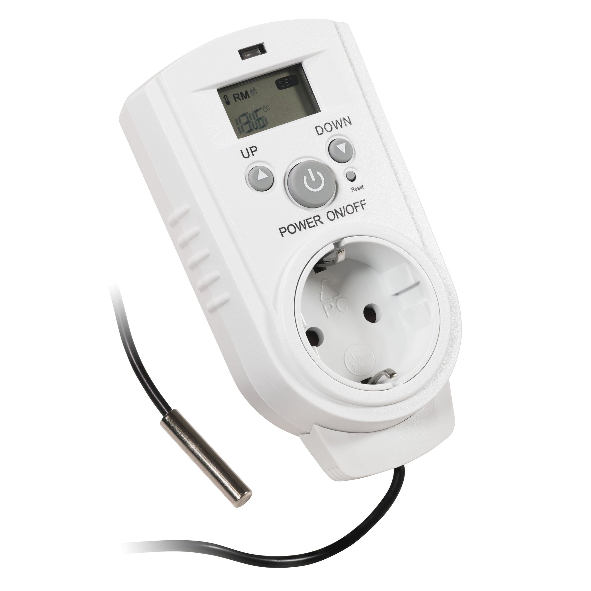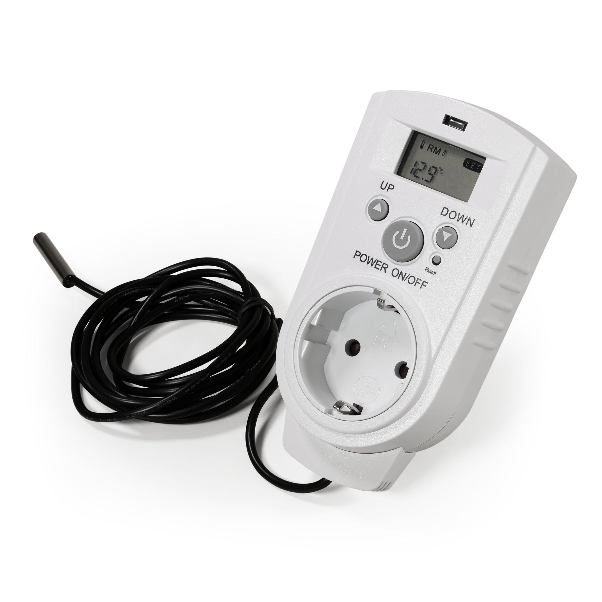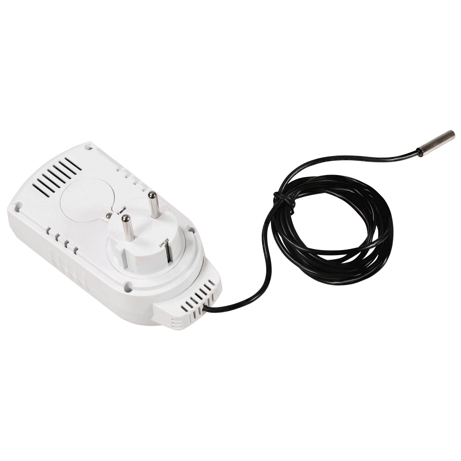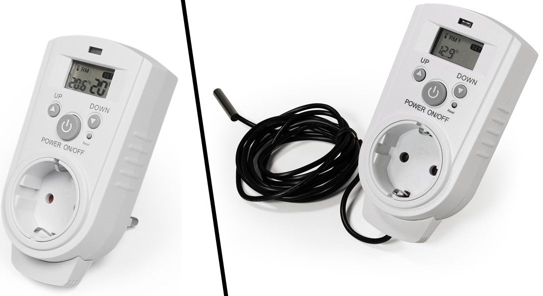 Die zweite Variante ist ein Steckdosen-Thermostat mit Display und einem Außenfühler. Dieses Modell verfügt über ein ca. 1,9m langes Kabel mit einem wasserfesten Außenfühler, der es ermöglicht, die Temperatur im Freien zu messen und entsprechend zu regulieren. Dieses Modell ist besonders nützlich für Gewächshäuser, Terrarien oder andere Anwendungen, bei denen eine genaue Temperaturmessung im Freien erforderlich ist.