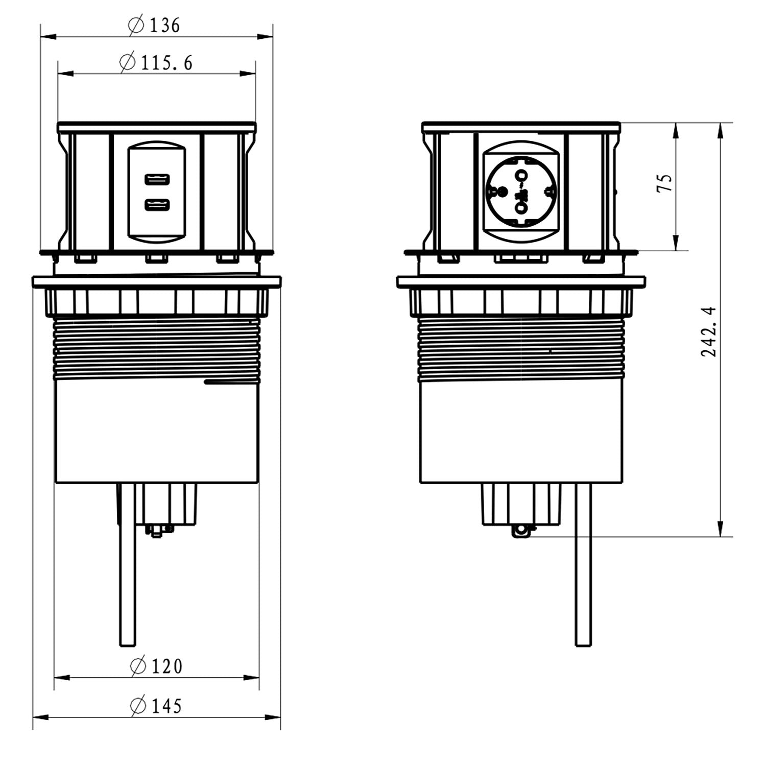 Runde Steckdose lässt sich einfach in die Arbeitsplatte integrieren, dafür wird lediglich ein Bohrloch mit einem Durchmesser von 120mm benötigt. Beim Nichtverwenden, versinkt die Mehrfachsteckdose dank der praktischen PopUp- Funktion, durch leichtes Drücken, einfach in der Montageöffnung, und wird nahezu eben mit der Arbeitsfläche.