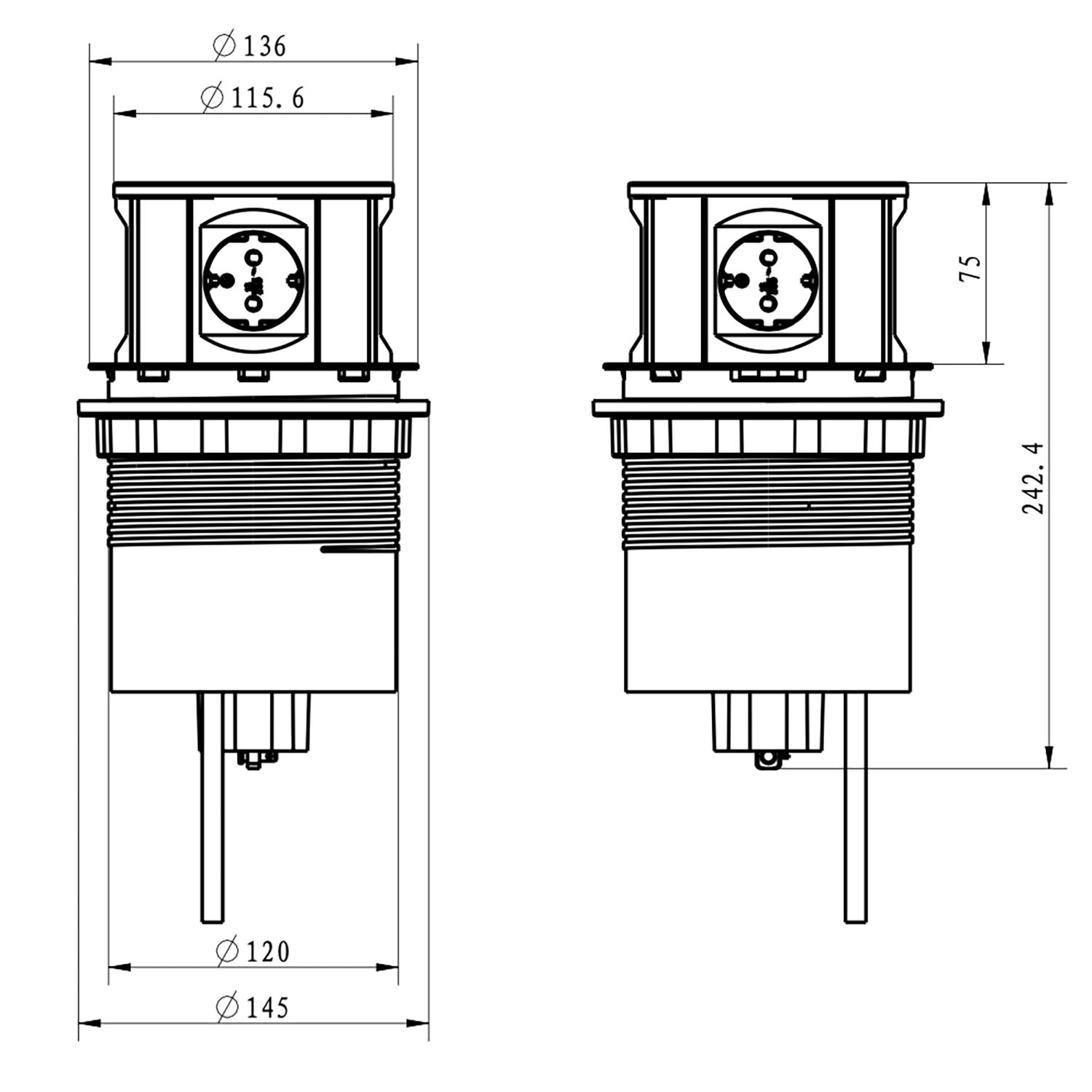 Des Weiteren verfügt die Steckdose über ein praktisches 2 Meter langes Anschlusskabel, ebenfalls mit EU - Stecker, welches an eine 230 Volt Stromquelle angeschlossen wird. Die Nennleistung dieser modernen Popup Steckdose beträgt 10A.