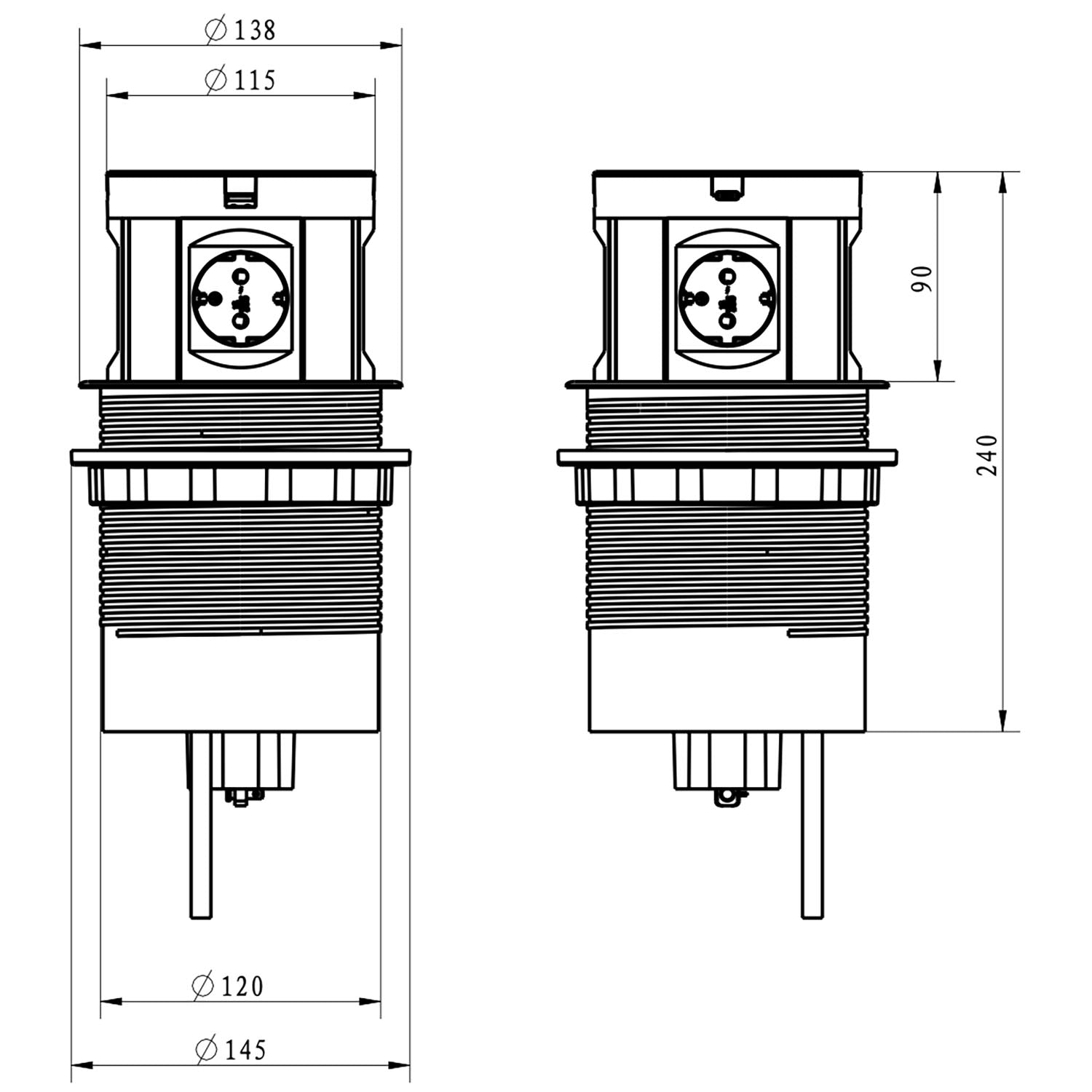 Die Gesamthöhe des Produktes beträgt hierbei 240 Millimeter, der nach oben aus der Arbeitsfläche herausragende Teil der Steckdose mit USB Anschlüssen hat eine Höhe von 90 Millimetern.