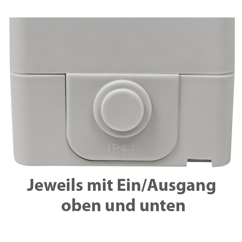 Dank der Schutzart IP44 sind die Steckdosen spritzwassergeschützt und widerstandsfähig. Der robuste Aufbau mit einem grauen Rahmen und einem schwarz gefederten Klappdeckel schützt die Steckdosen zuverlässig. Ein integrierter Einsteckschutz (Shutter) bietet zudem extra Sicherheit für Kinder und Haustiere.