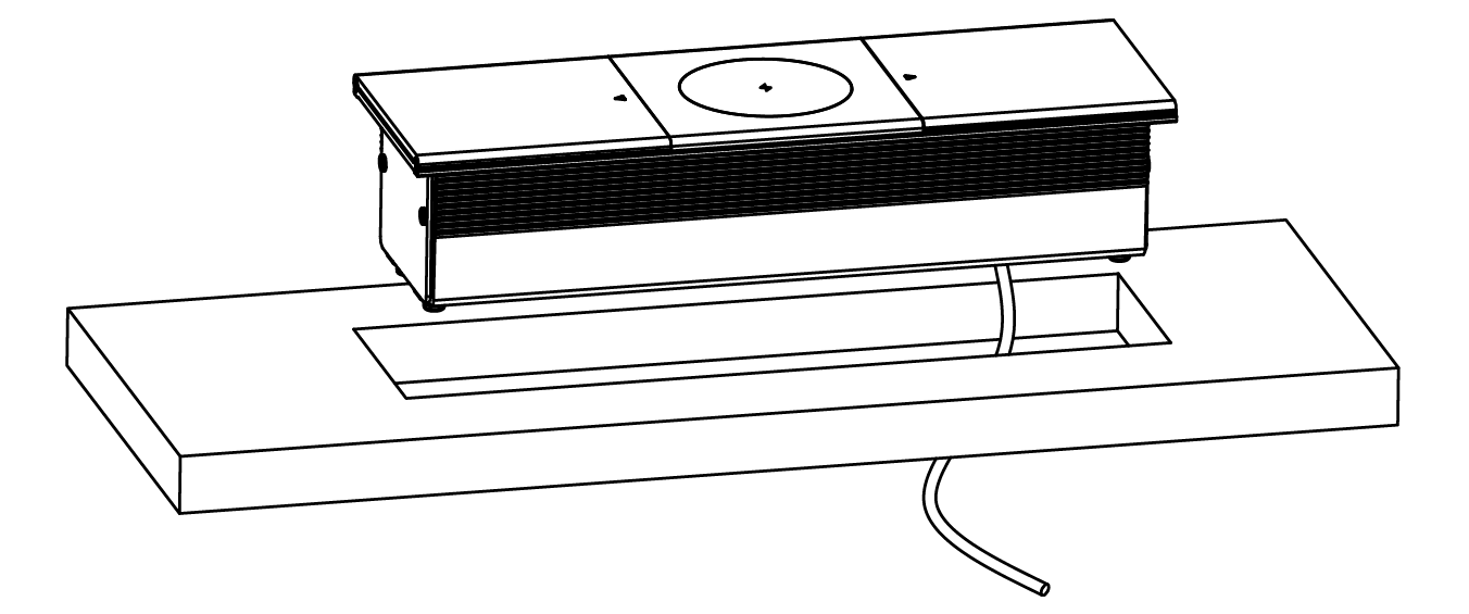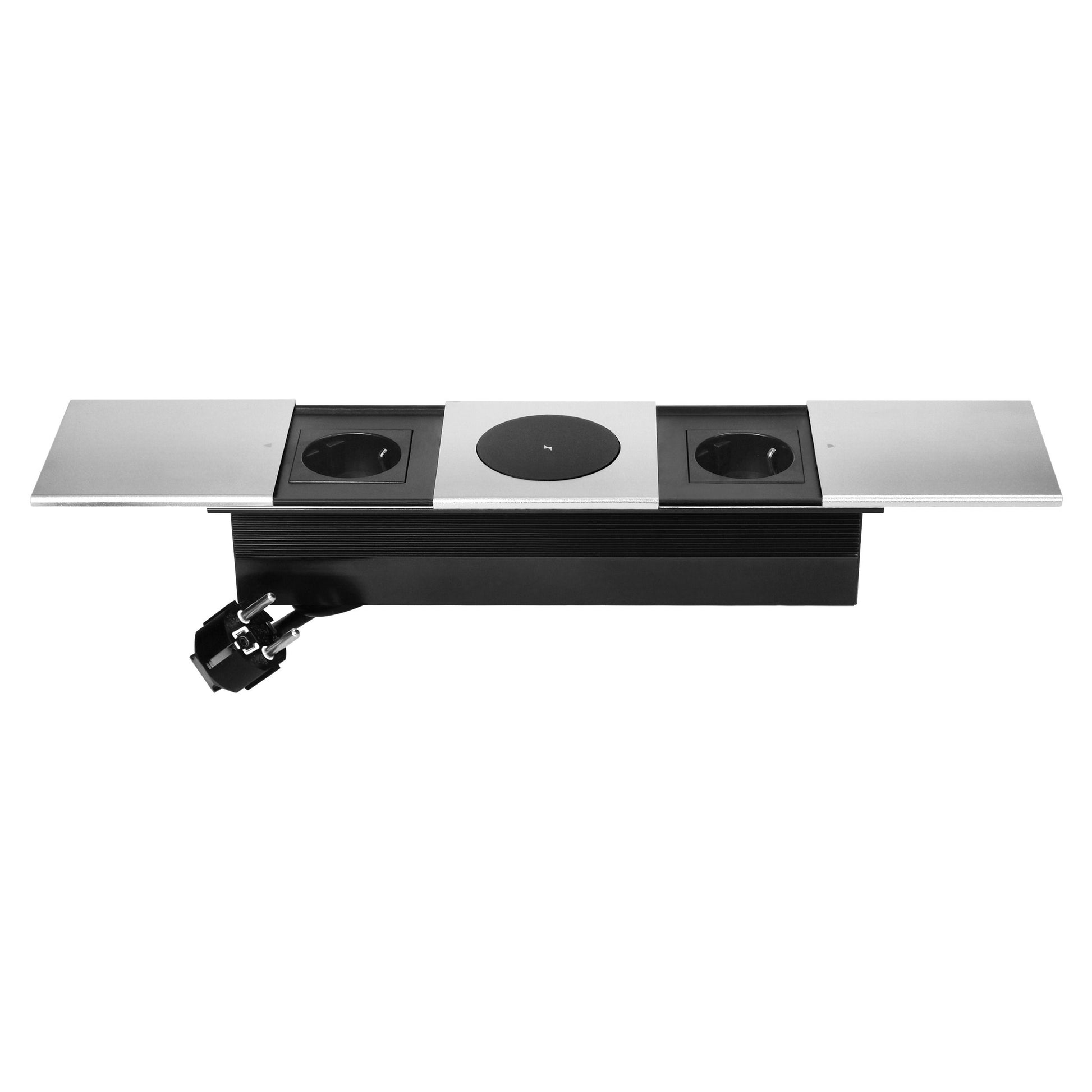 Trano Einbau-Möbelsteckdose mit Schiebedeckel 2x Schuko 3680W, 1,8m Kabel, Qi 15W Wireless Charger, Aluminium Silber, Einbau 258x86mm