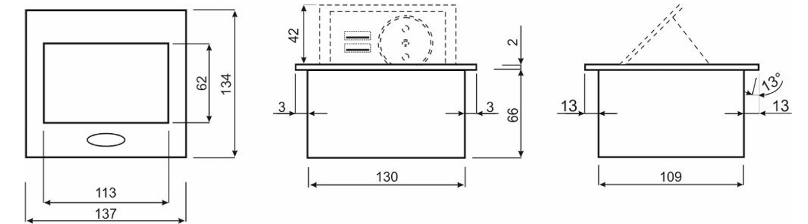 Kompakte Maße: Außenmaß 134x137x68mm, Einbaumaß 111x131mm, Einbautiefe 66mm – passt in gängige Möbel-Ausschnitte.
