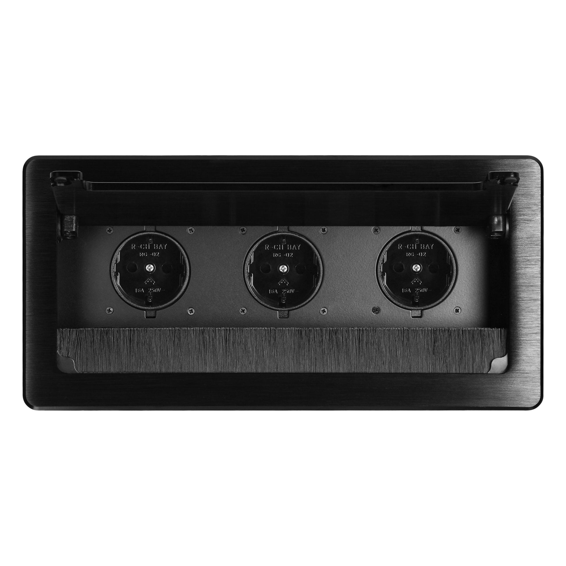 Trano Einbausteckdose 3x Schuko Typ F, flacher Rand 2mm, Anti-Staub-Bürste, 1,5m Kabel, 3680W, IP20, schwarz 265x130mm