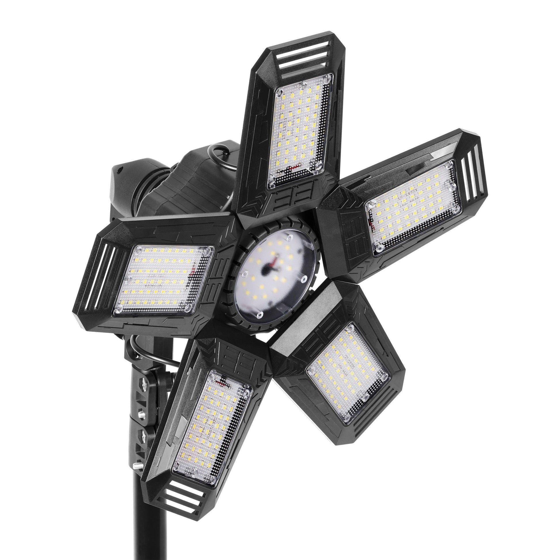 Die klappbare Arbeitsleuchte verfügt über 6 LED-Lichtquellen – 5 verstellbare Seitenflügel und ein zentrales LED-Panel – die zusammen einen Lichtstrom von 4950 Lumen erzeugen. Die Farbtemperatur von 6500K sorgt für kaltweißes Licht, das Arbeitsbereiche präzise ausleuchtet. Die Flügel lassen sich um bis zu 90° verstellen und bei Bedarf platzsparend einklappen (Maße: 330x330 mm).
