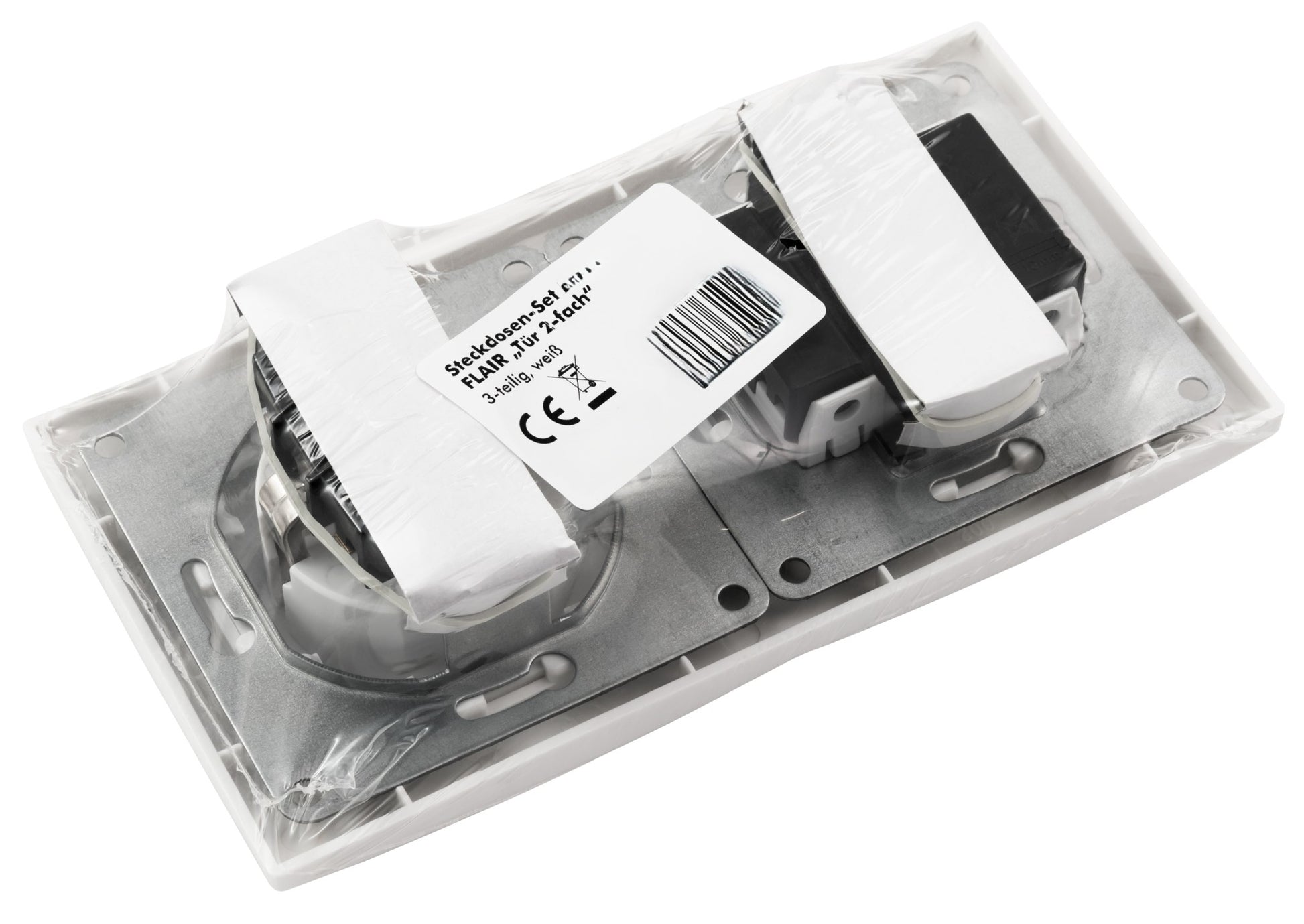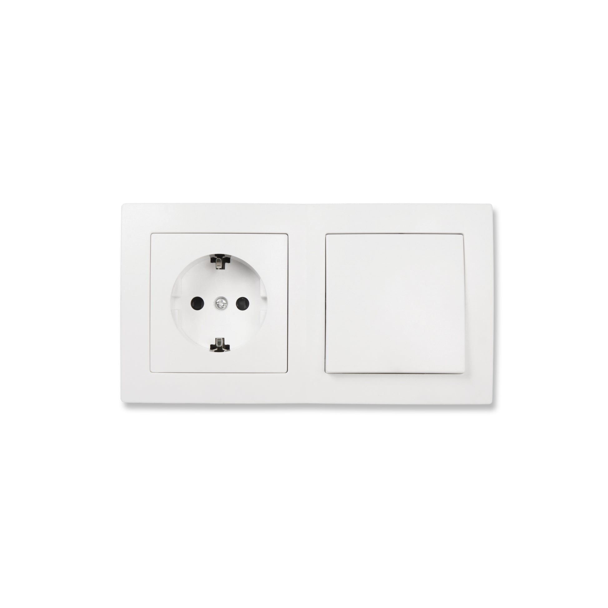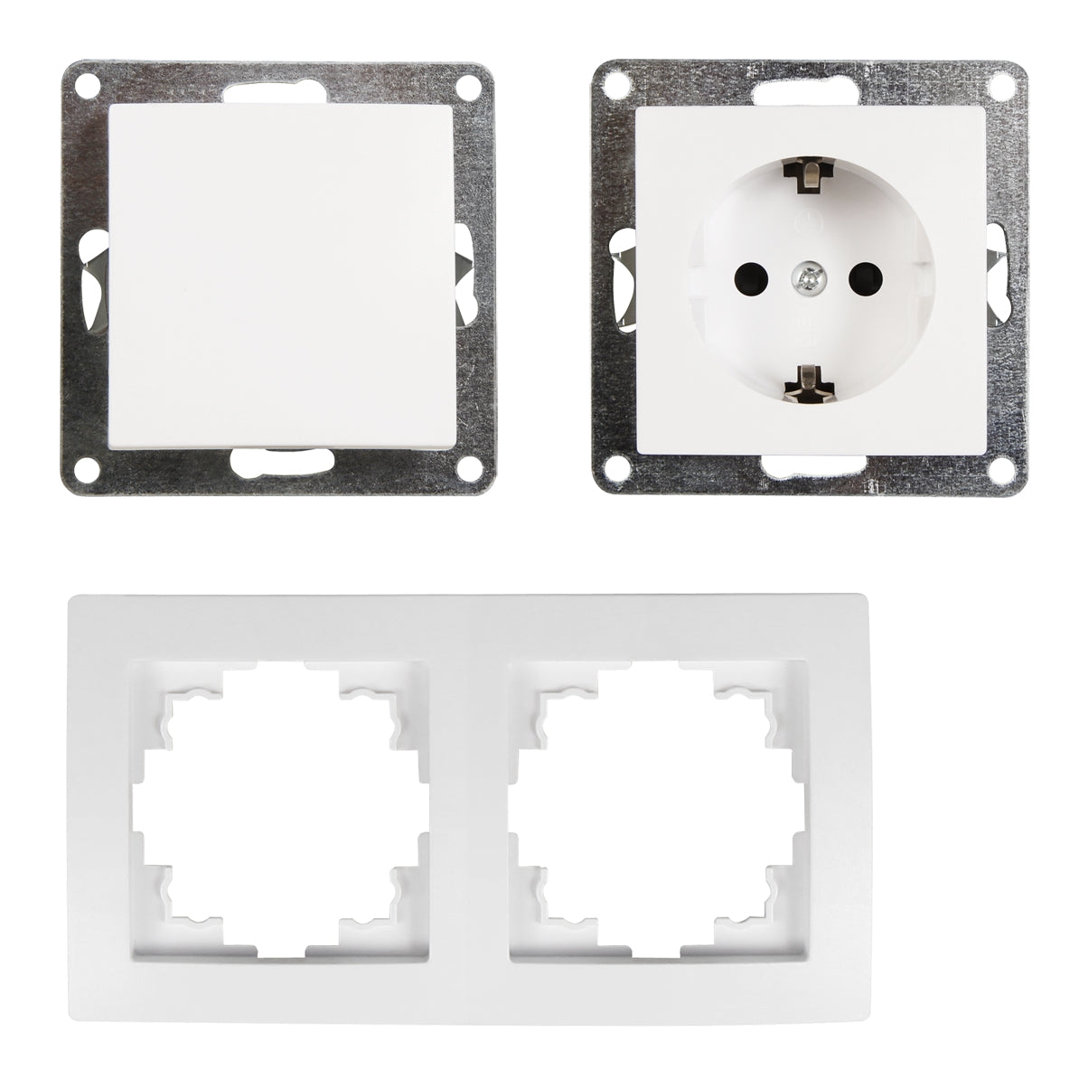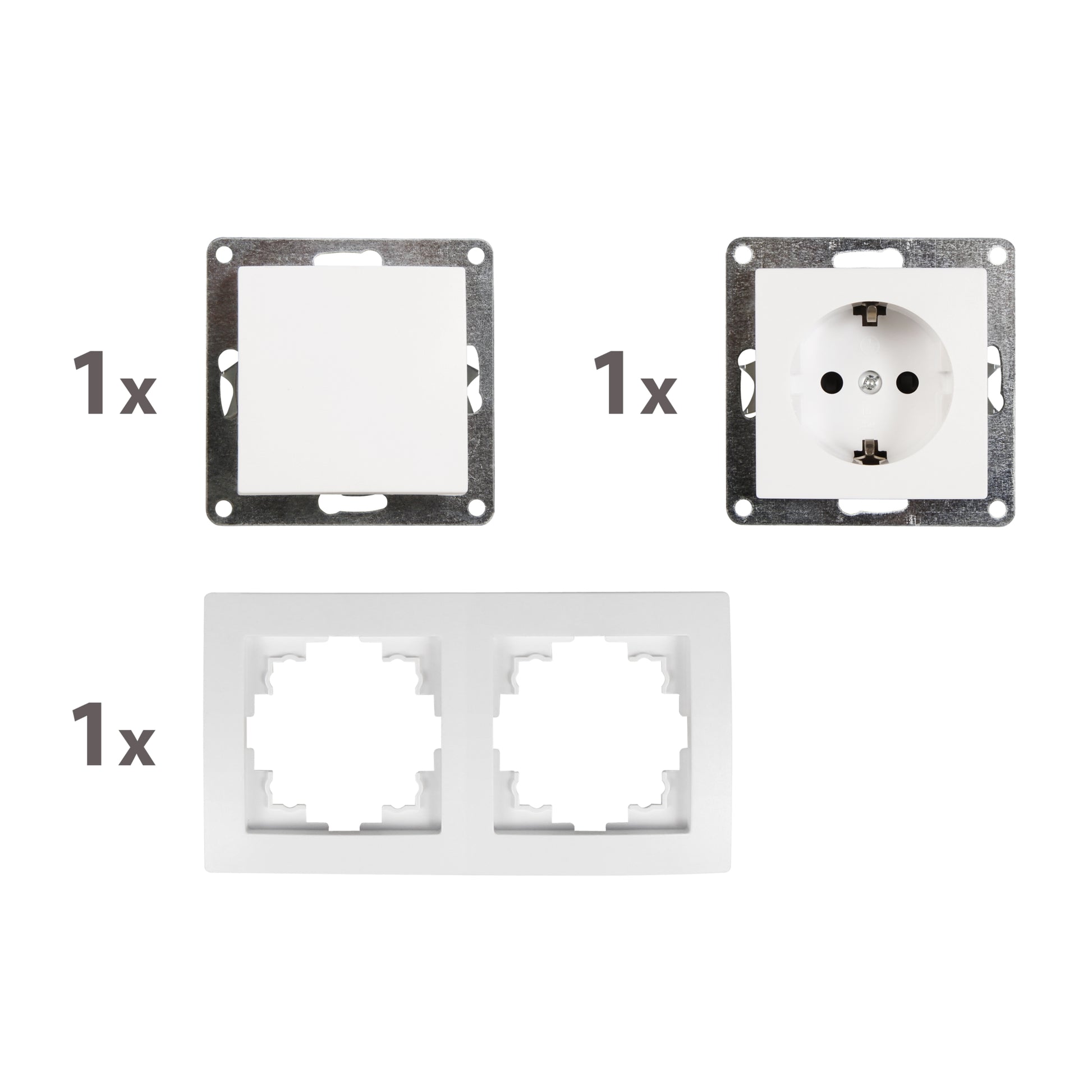 Komplett-Set: Mit Wechselschalter, Schutzkontakt-Steckdose und passendem 2-fach Rahmen erhalten Sie alles, was Sie für eine moderne Installation benötigen.