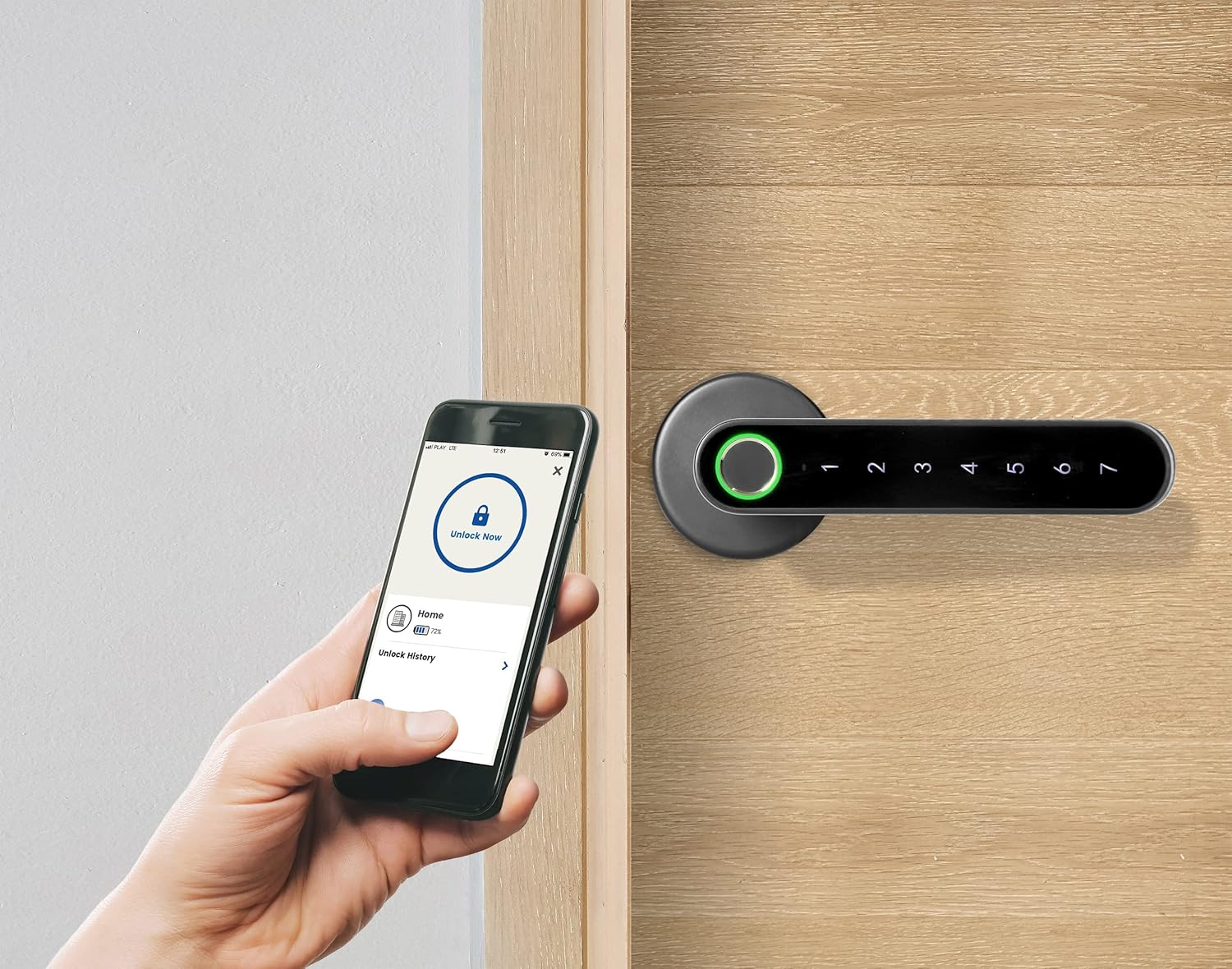 Der Trano Smarte Türgriff vereint modernes Design mit innovativer Sicherheitstechnologie. Ausgestattet mit einer Touch-Tastatur, einem Fingerabdruckleser und Bluetooth 4.0, bietet er flexible Möglichkeiten zum Öffnen der Tür – per PIN-Code, Fingerabdruck oder Smartphone-App.