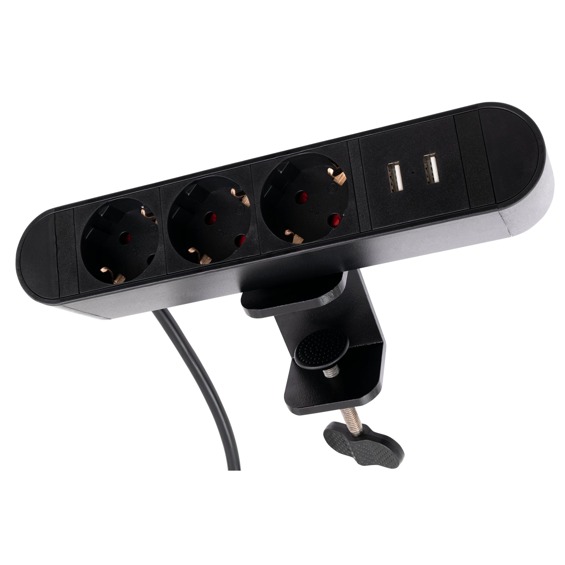 Trano Tischsteckdose mit Klemme, 3-fach Steckdosenleiste, 2x USB-A Ladebuchsen (2,1A), Schreibtisch Mehrfachsteckdose, 2m Kabel, Homeoffice Stromverteiler, max. 3600W, Schwarz